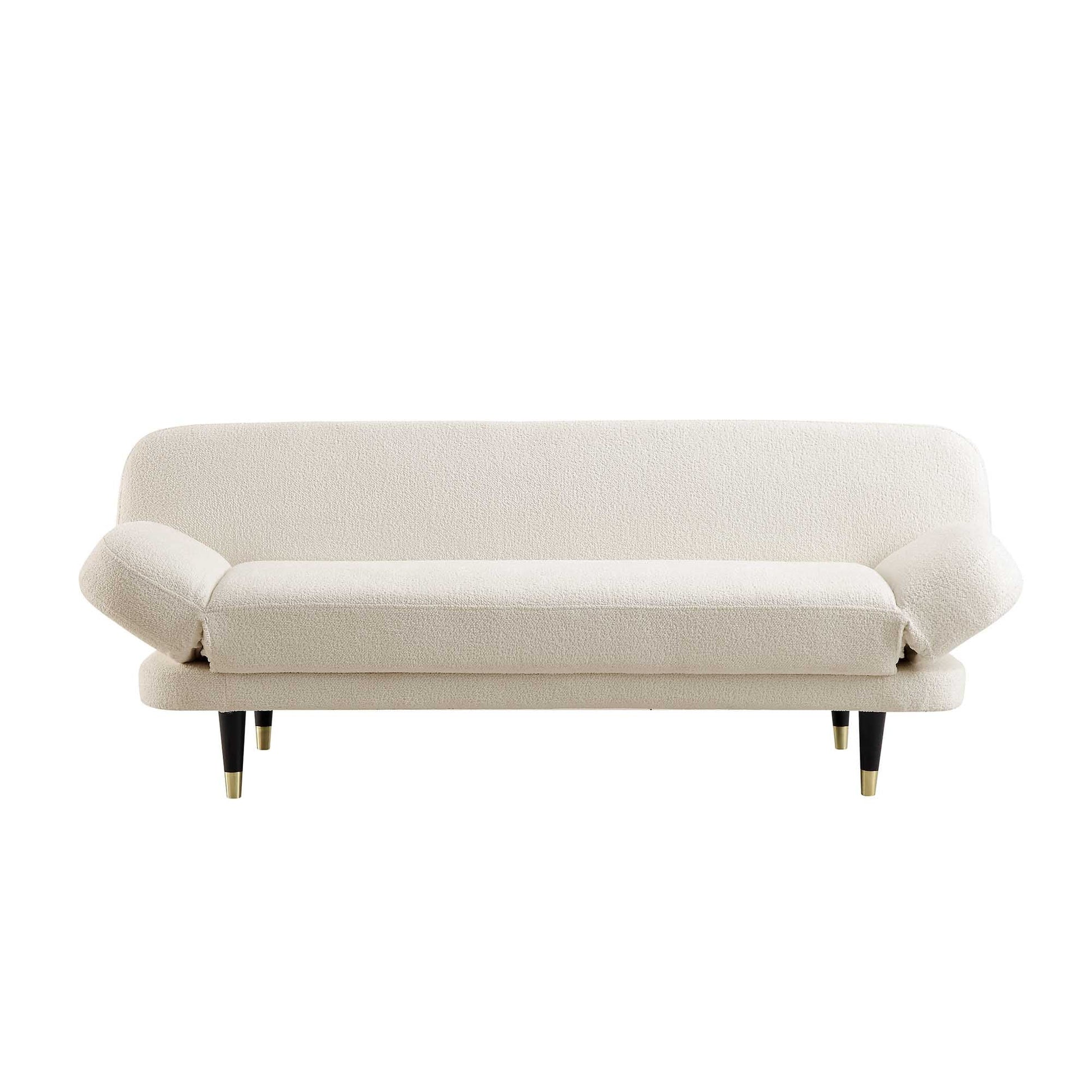 - Upholstered in stunning beige boucle fabric, our Solna sofa bed is supported by solid wood internal frame, accented with brass tipped black wooden legs for a mid-century look.