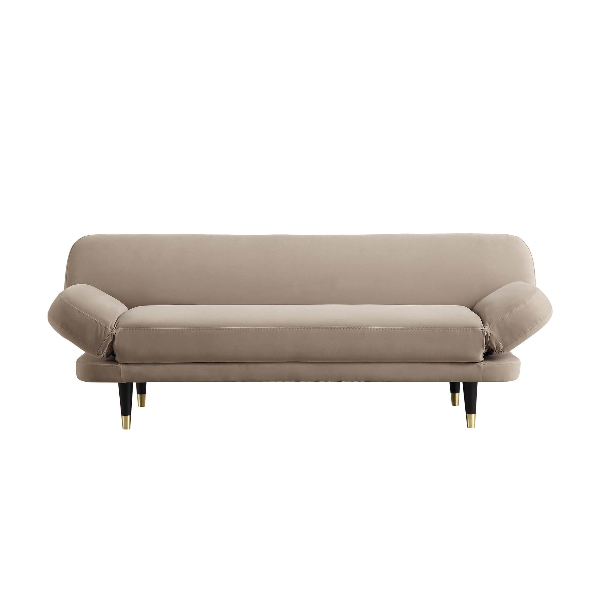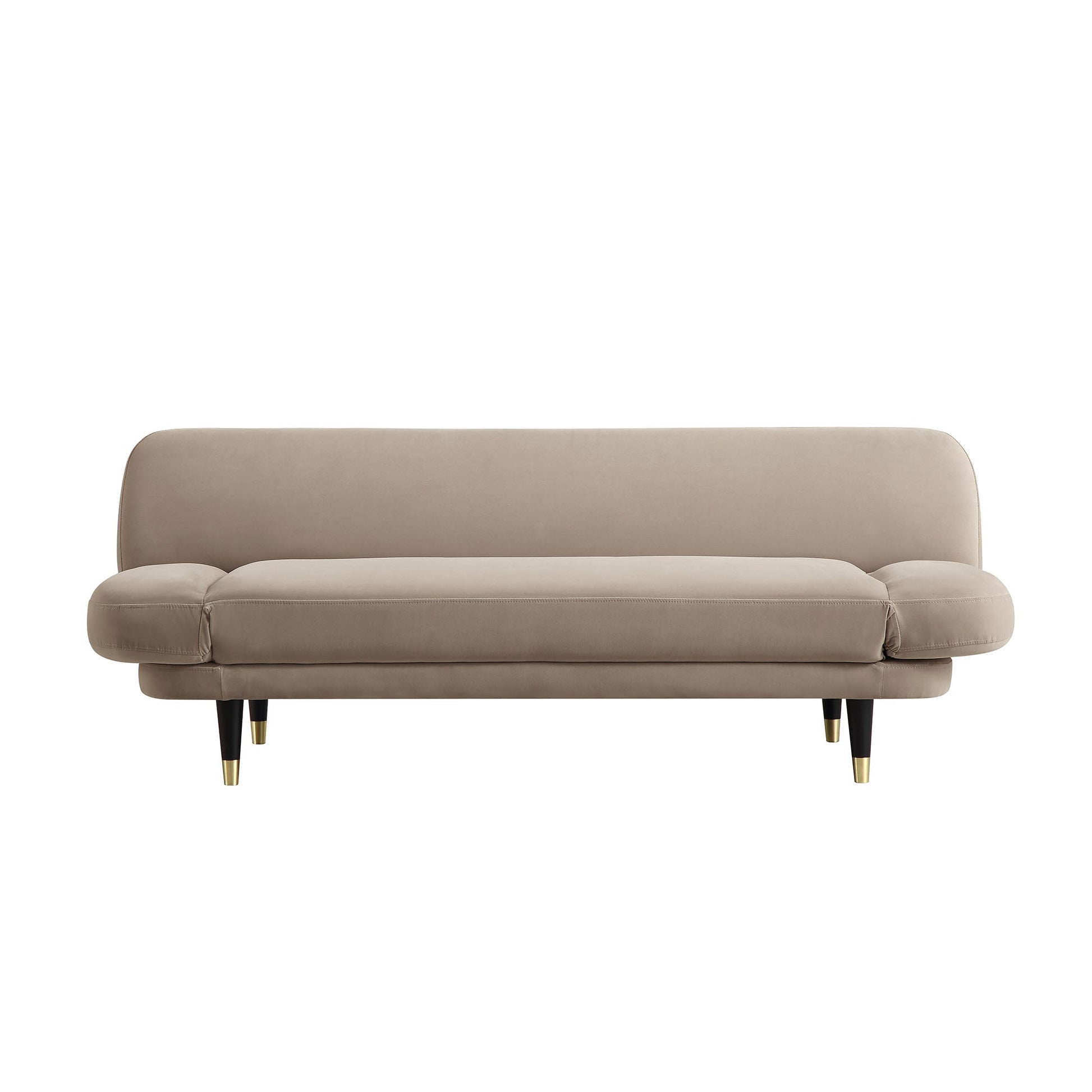 - Upholstered in sumptuous mink colour velvet touch fabric, our Solna sofa bed is supported by solid wood internal frame, accented with brass tipped black wooden legs for a mid-century look.