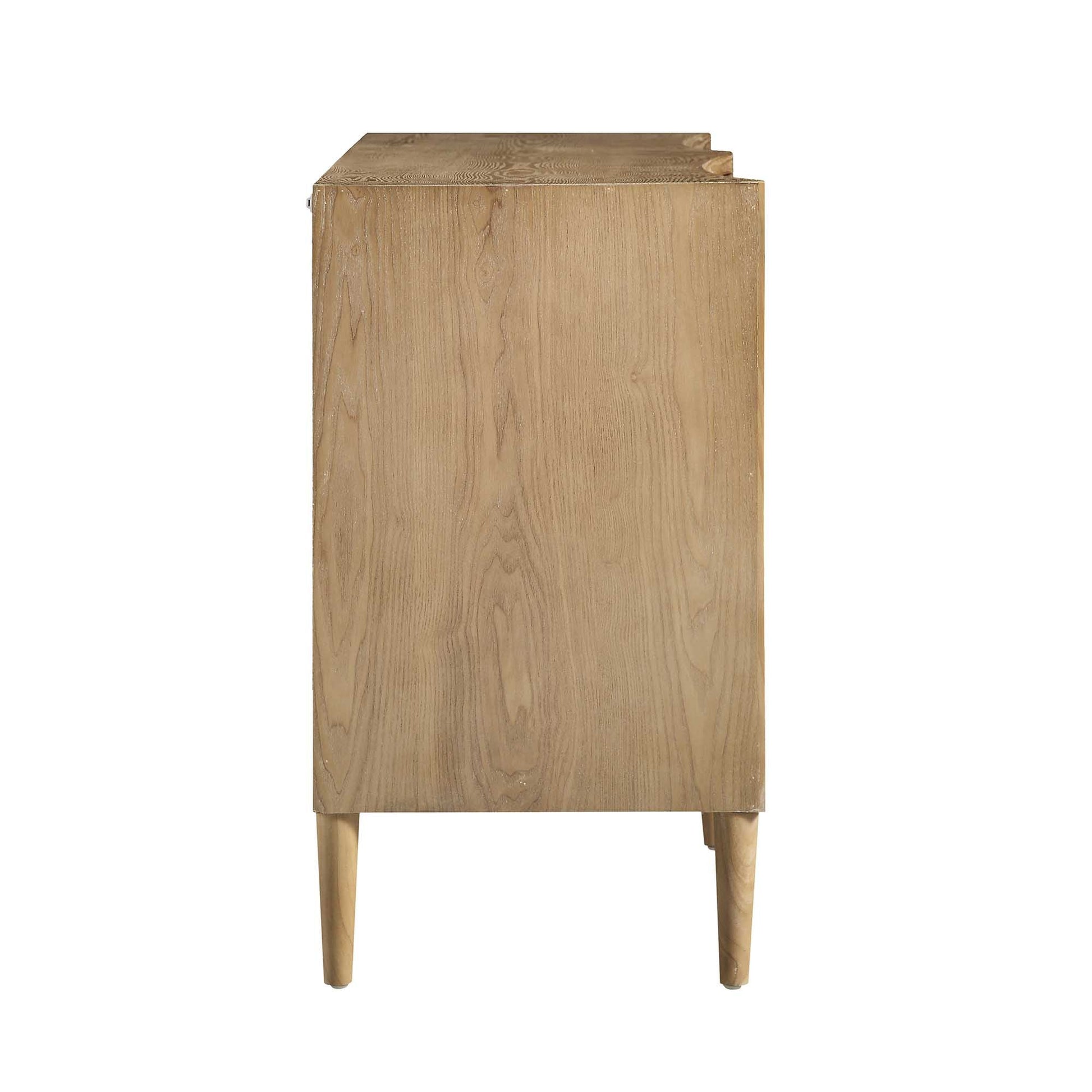 - Gently concave drawer fronts are complemented with the aged brass clove metal handles.