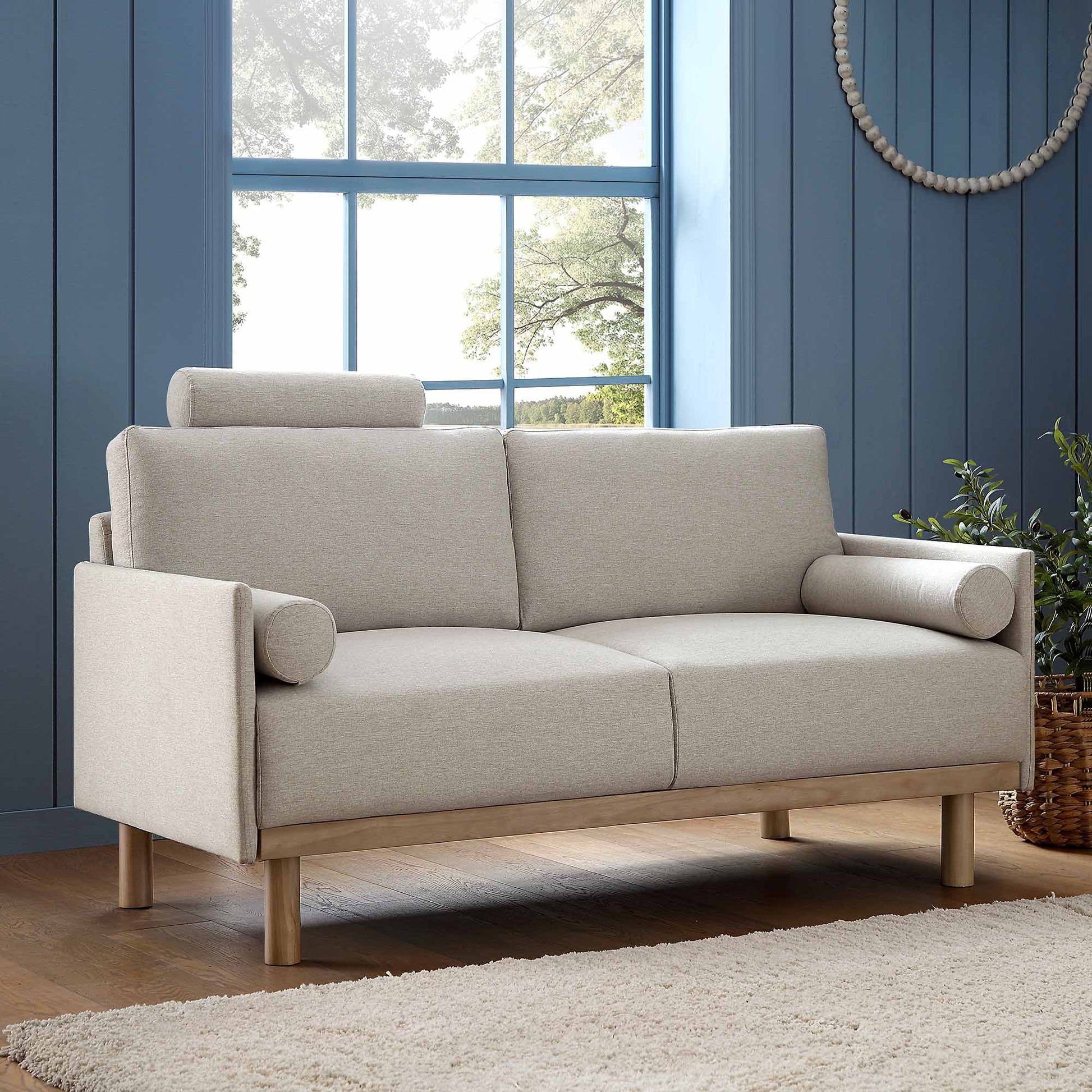 - Complete the look: Pictured with our Timber Oatmeal Fabric Sofa is our Luna Round Bobbin Wall Mirror