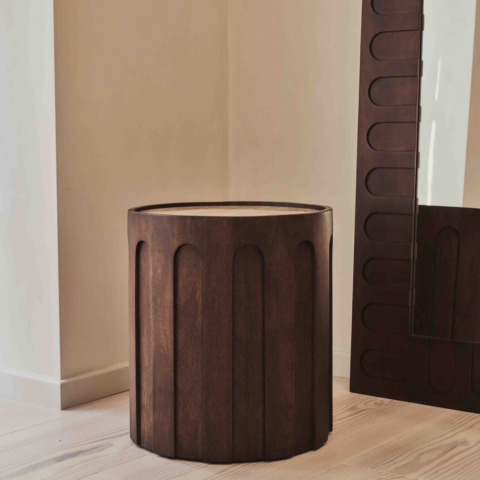 Valor - Beige Travertine Round Dark Wood Premium Side Table