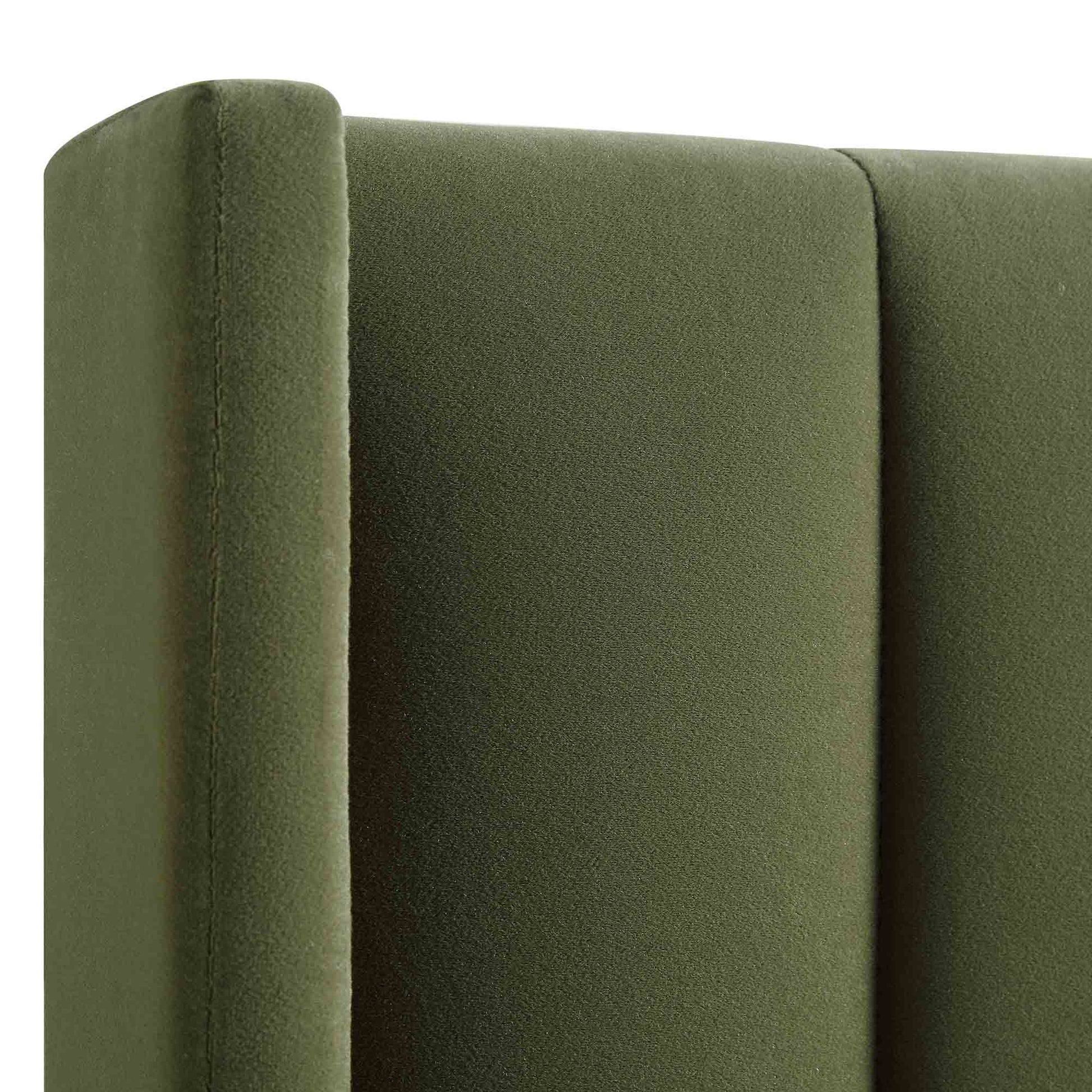 - The padded headboard with vertical tufting complements the sumptuous moss green velvet touch upholstery.